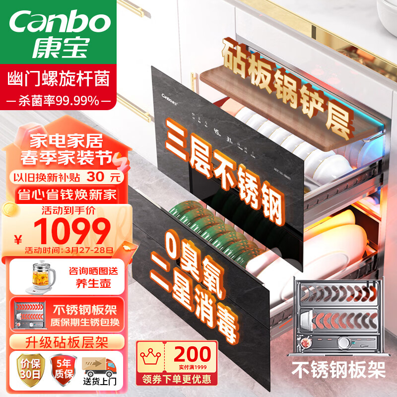 康宝(Canbo)不锈钢 消毒柜 嵌入式 家用 大容量紫外线 消毒碗柜 二星高温小型厨房碗筷餐具大升数XDZ100-EN301价格:1099.00元!