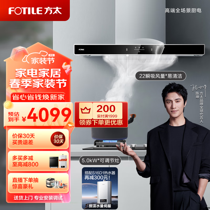 方太抽油烟机 烟灶套装 燃气灶套装欧式顶吸油烟机灶具套装烟机家用 22瞬吸风量EMC5A+TH27B天然气价格:4099.00元!