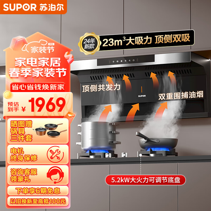 苏泊尔(SUPOR)抽油烟机 顶侧双吸7字型烟灶套装23立方挥手免拆洗家用烟机燃气灶具套装DL11+DB28天价格:1969.00元!