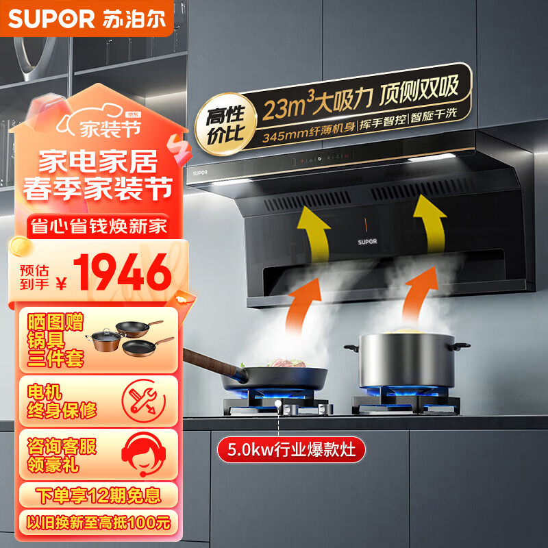 苏泊尔(SUPOR) 抽油烟机 顶侧双吸7字型烟灶套装23立方挥手免拆洗家用烟机燃气灶具套装DE15+Q5天价格:1946.00元!