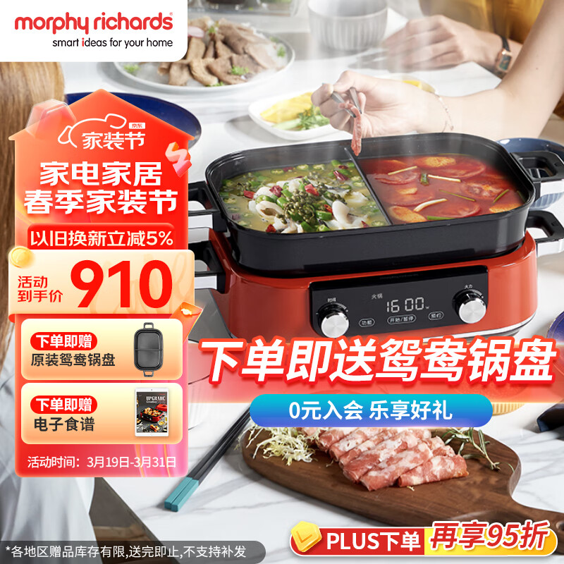 摩飞电器(Morphyrichards)多功能锅 家用电火锅电蒸锅 5升可预约 大功率分体式蒸煮一体不沾煎烤料理锅 MR9099 英石红价格:910.00元!