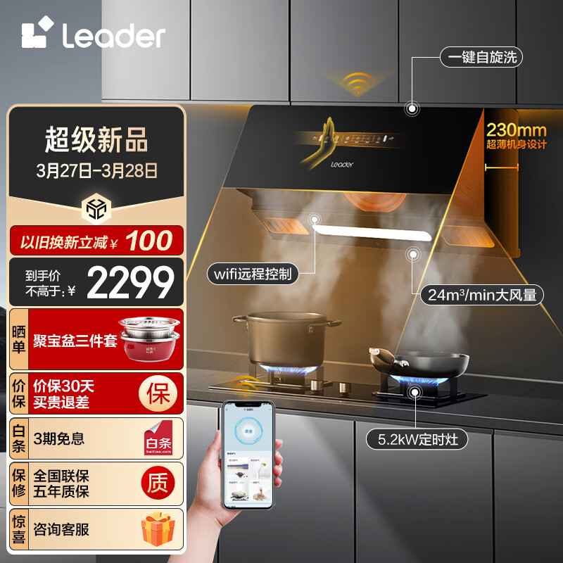 Leader海尔智家出品 抽油烟机 超薄近吸烟灶套装 24m3/min大吸力 家用油烟机燃气灶套装C2U1+Q2BE7天价格:2299.00元!