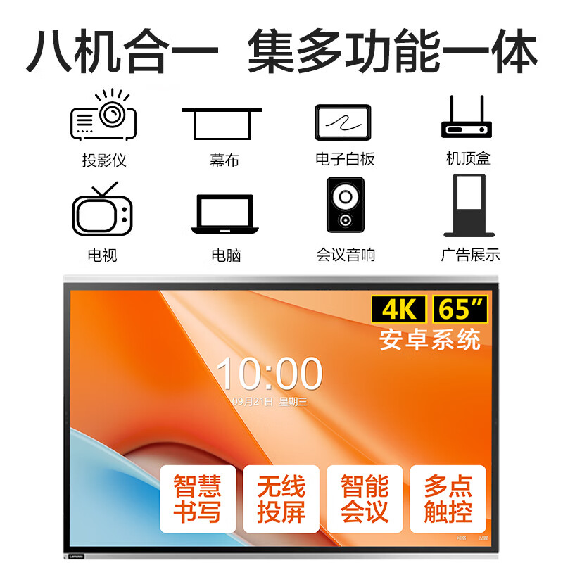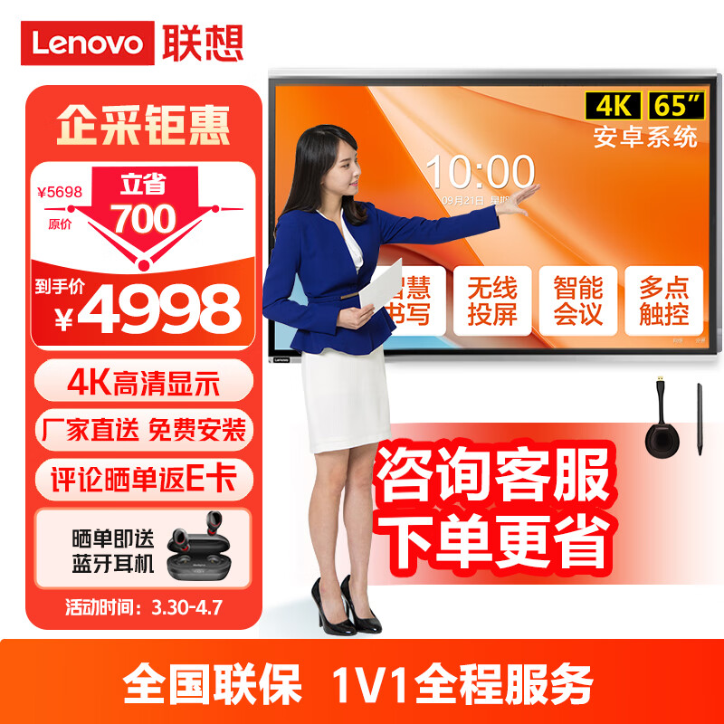 联想thinkplus 会议平板一体机 65英寸 触控屏 智能电子白板 会议电视 教学培训办公 含壁挂架传屏器价格:4698.00元!