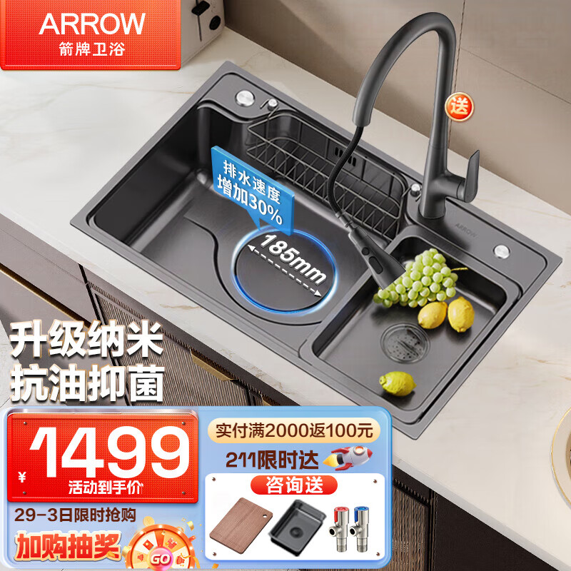 箭牌(ARROW)304不锈钢日式水槽大单槽洗菜盆纳米台上台中台下洗碗池 75*48纳米单槽-冷热枪灰抽拉龙头价格:1859.00元!