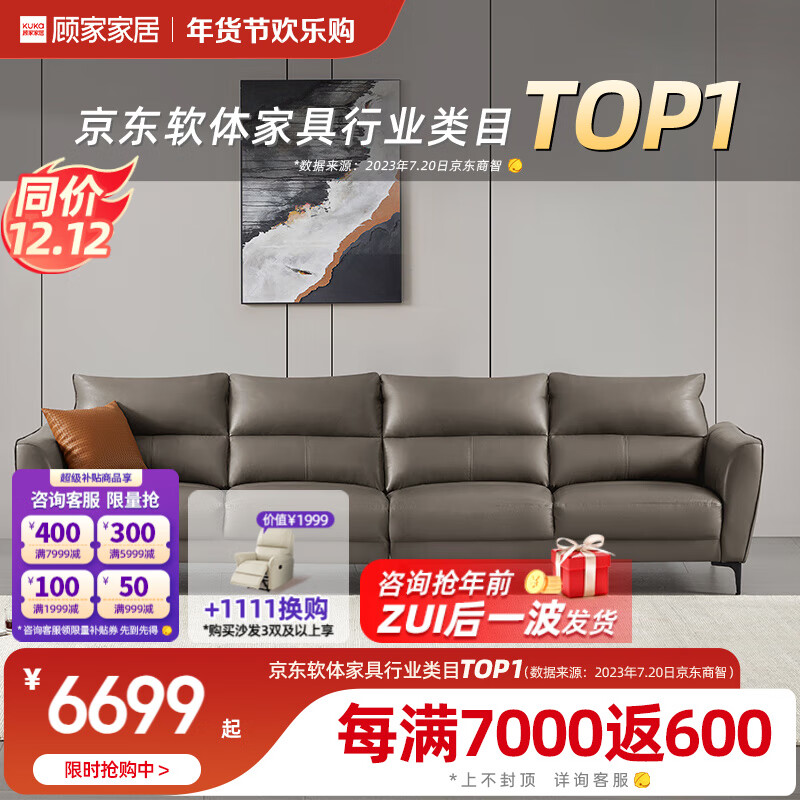 顾家家居(KUKA)皮沙发现代轻奢沙发客厅沙发1107【深空灰】四人位大坐深春节后发货价格:6699.00元!