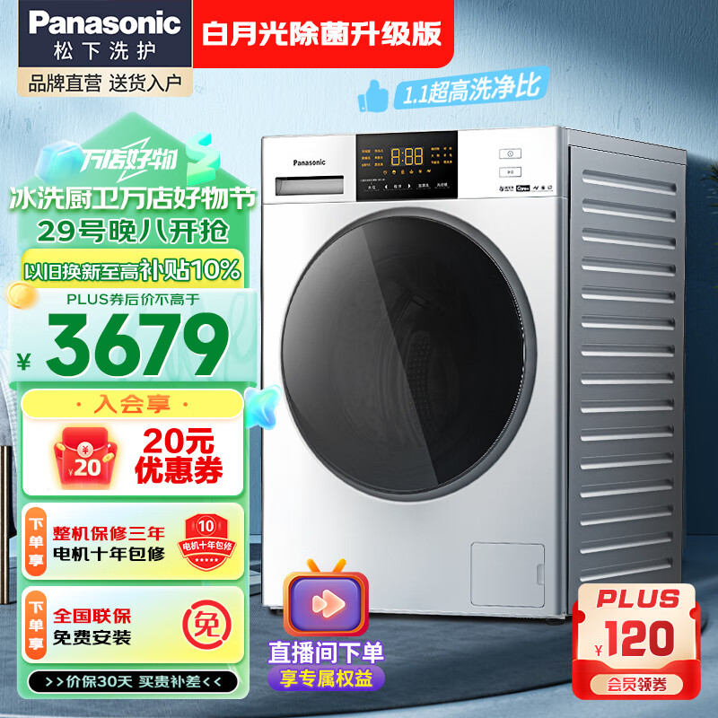 松下(Panasonic)洗衣机滚筒全自动10公斤大容量泡沫净 光动银常温除菌 BLDC变频电机节能导航【白月光除菌升级版】 XQG100-NVAE【光动银除菌】价格:3899.00元!