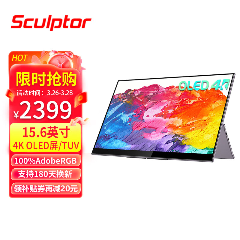 雕塑家15.6英寸4K OLED便携式显示器Type-C外接移动分屏手机电脑笔记本分屏专业设计师移动拓展副屏价格:2499.00元!