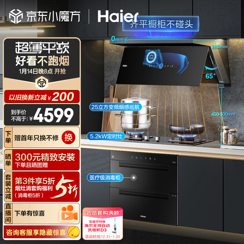 海尔(Haier)平嵌大师系列 烟灶消三件套 25m3/min变频有效风 5.2KW定时灶 医疗级消毒C21U1+Q2BE7天+EB03价格:4599.00元!