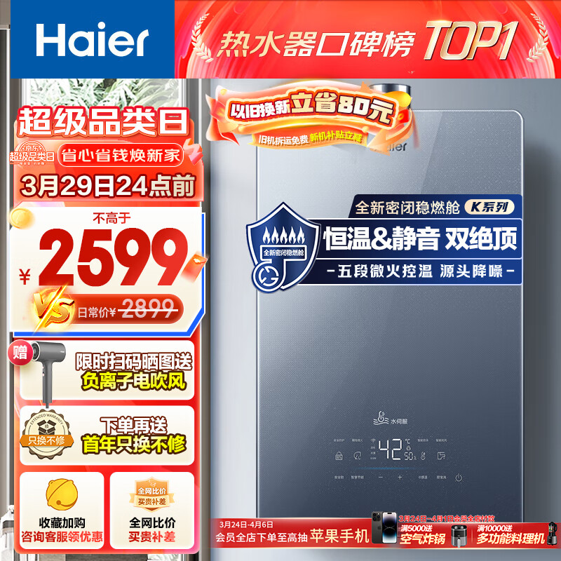 海尔(Haier)16升【K系列KL5】燃气热水器天然气 无级变频水伺服 五段微火 一级静音屏JSQ31-16KL5锦绣U1价格:2799.00元!