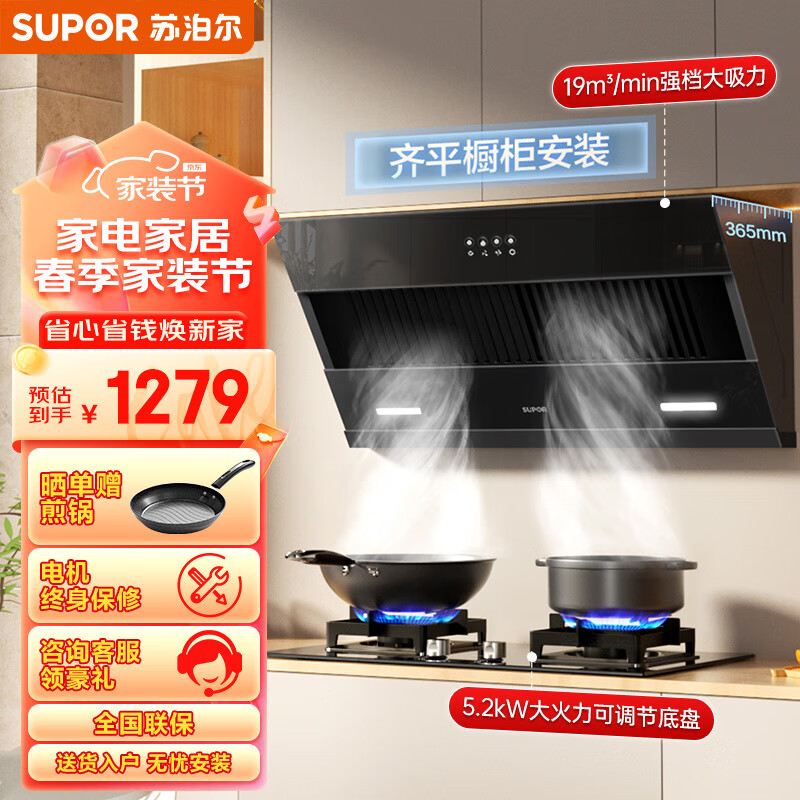 苏泊尔(SUPOR)抽油烟机燃气灶套装 家用小尺寸大吸力 19立方侧吸式小户型烟灶套装DJ13S+DB28液化气价格:1279.00元!