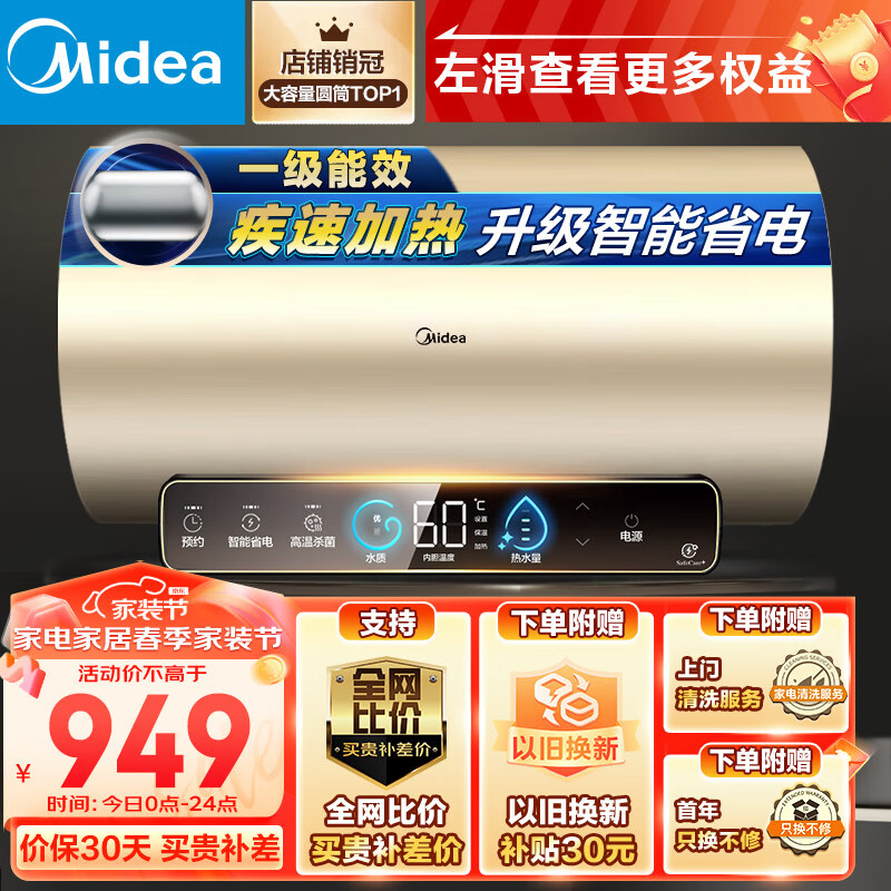 美的(Midea)家用60升3300W大功率电热水器速热大水量健康水质监测珐琅无缝内胆一级能效智能省电F6032-JE3(HE)价格:1149.00元!