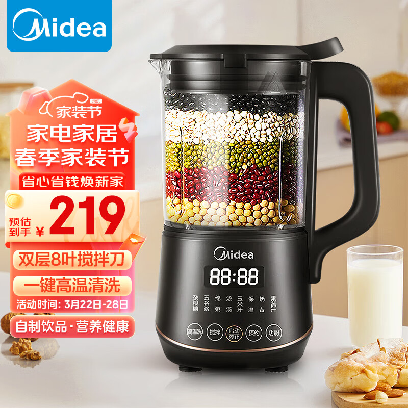 美的(Midea)破壁机小型家用免过滤豆浆机 多功能预约加热料理机保温早餐机双层8叶搅拌PB40X2-701A价格:219.00元!