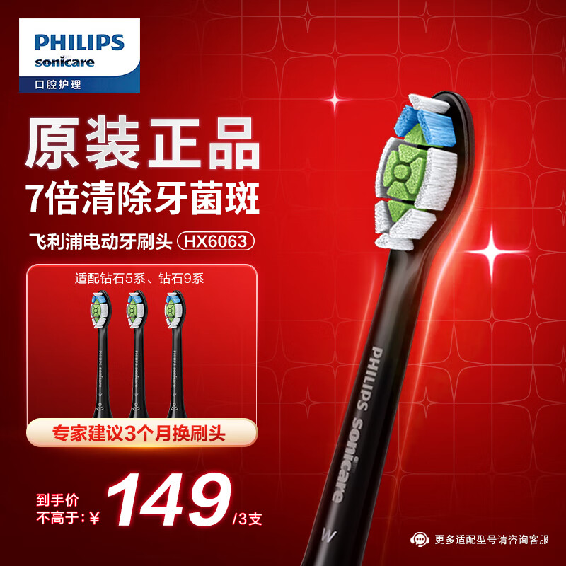 飞利浦(PHILIPS)电动牙刷刷头 钻石亮白型刷头W2 HX6063/96 3支装 黑色 适配钻石5系、9系价格:149.00元!