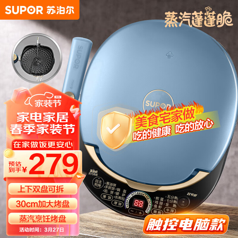 苏泊尔(SUPOR)电饼铛 上下盘可拆洗 家用双面加热加大加深烙饼煎饼 早餐机多功能蒸汽煎烤机电饼档 JD30RQ859价格:324.00元!