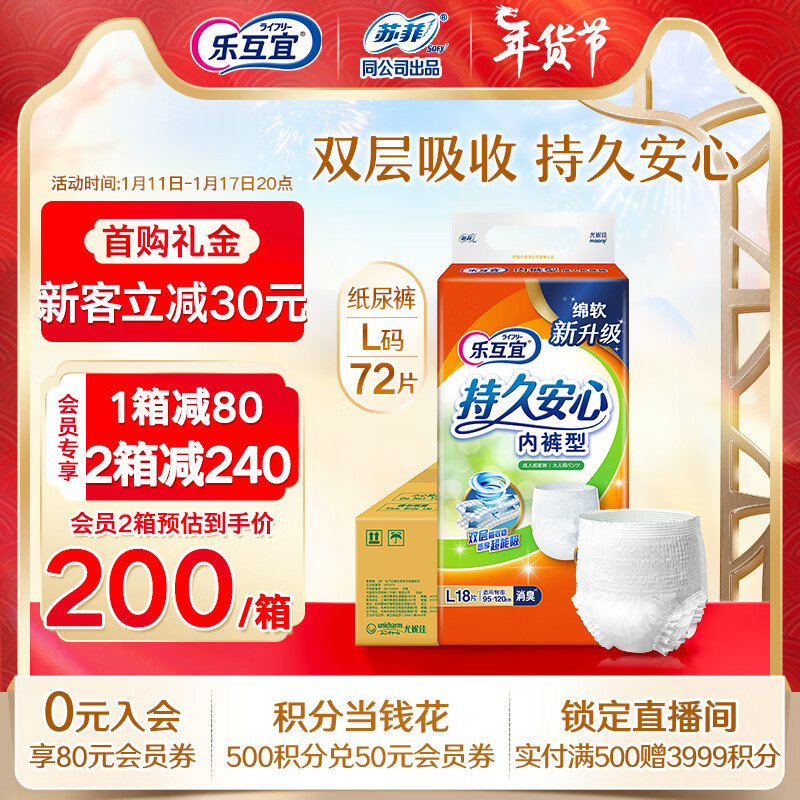 乐互宜持久安心成人拉拉裤老人孕妇专用长效吸收内裤型L码72片/箱价格:320.00元!