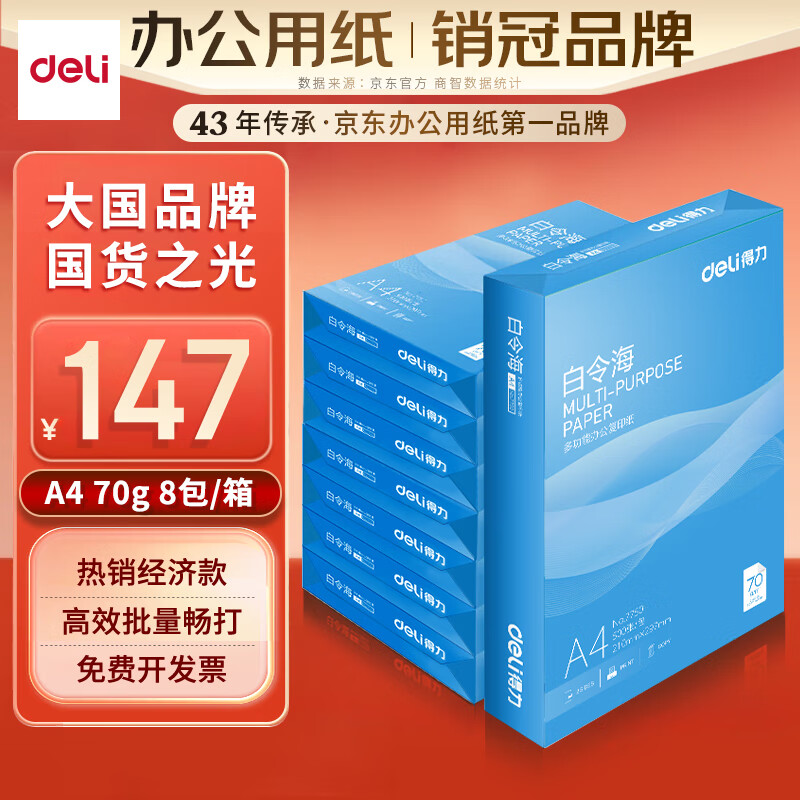 得力(deli)白令海A4打印纸 70g500张*8包一箱 双面高性价比复印纸 整箱4000张 7754【经济热销】价格:147.00元!