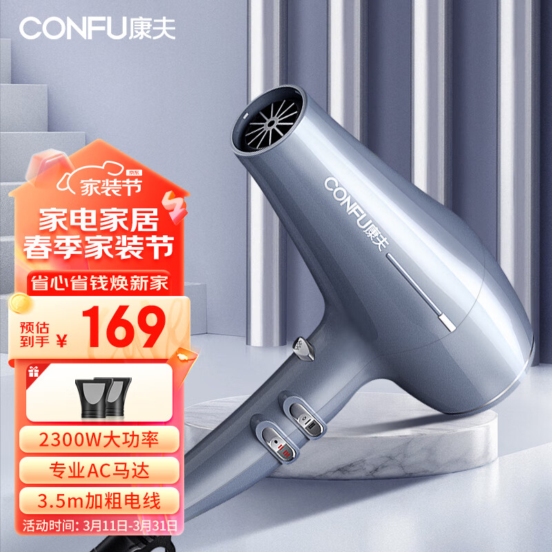 康夫(CONFU)家用电吹风机2300W大功率强劲大风力速干 恒温护发过热保护 发廊理发店吹风筒 KF-8949价格:169.00元!