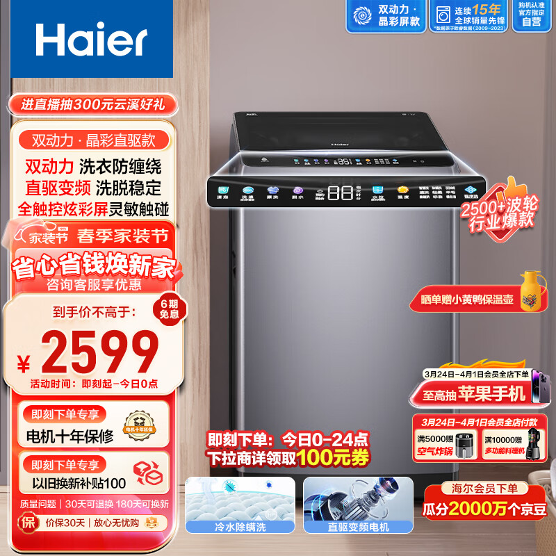 海尔(Haier)波轮洗衣机全自动 双动力防缠绕 10公斤变频 晶彩屏 羊毛洗 集速洗 除螨洗 以旧换新ES100B26Mate6价格:2899.00元!