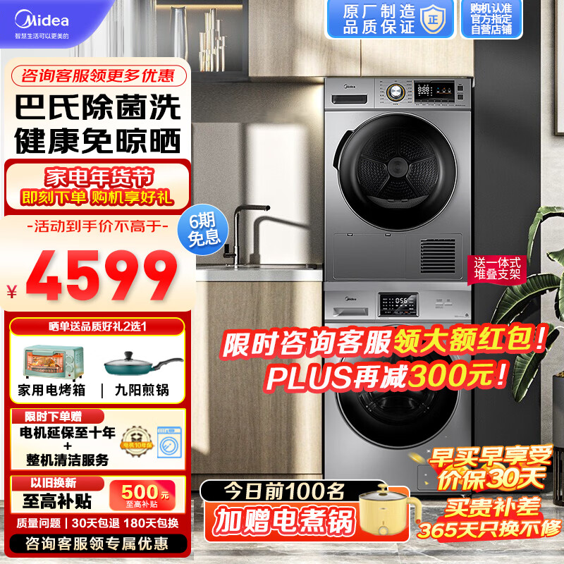 美的(Midea)洗烘套装 10公斤变频滚筒洗衣机+10公斤热泵式除菌干衣机 以旧换新 Y1YW+MH100VH05WY价格:4599.00元!
