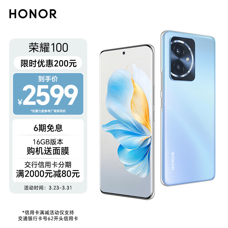 荣耀100 单反级写真相机 荣耀绿洲护眼屏 第三代骁龙7移动平台 16GB+256GB 迷蝶蓝 5G价格:2799.00元!