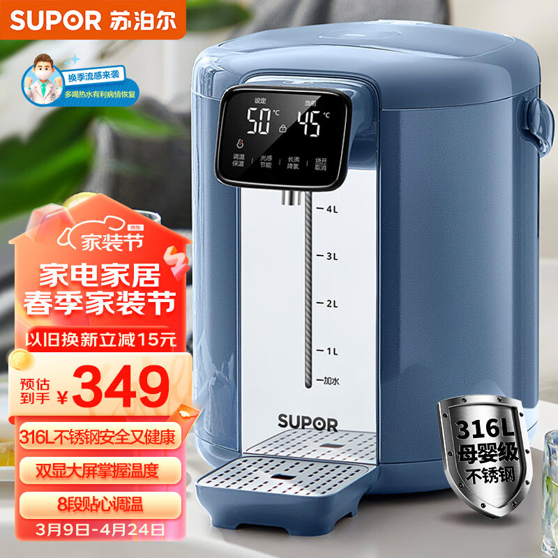 苏泊尔(SUPOR)苏泊尔(SUPOR)电热水瓶 双层电热水壶烧水壶 5L大容量316L不锈钢电水瓶 多段保温恒温 SW-50T103价格:349.00元!