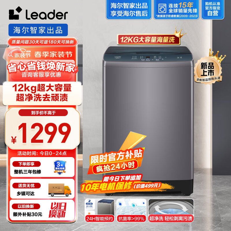 Leader海尔智家出品 波轮洗衣机全自动 12公斤大容量 超净洗去顽渍 洗衣参数可调 以旧换新 @B120Z369价格:1299.00元!