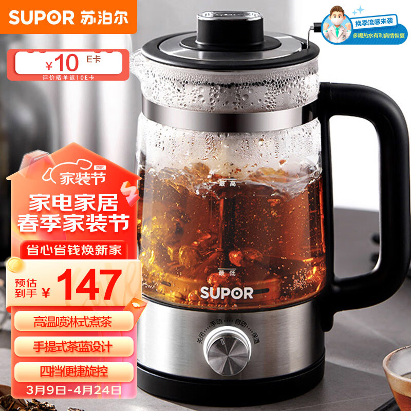 苏泊尔(SUPOR)养生壶 复古喷淋式煮茶器煮茶壶烧水壶1L 电热水壶迷你玻璃花茶壶黑茶 SW-10C05价格:147.00元!