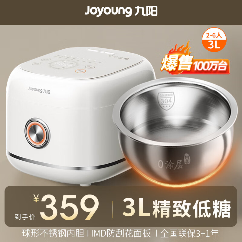九阳(Joyoung)【0涂层】3L2-6人家用多功能电饭煲电饭锅304不锈钢内胆低糖饭IMD防刮面板无涂层5A认证3升30N2价格:409.00元!