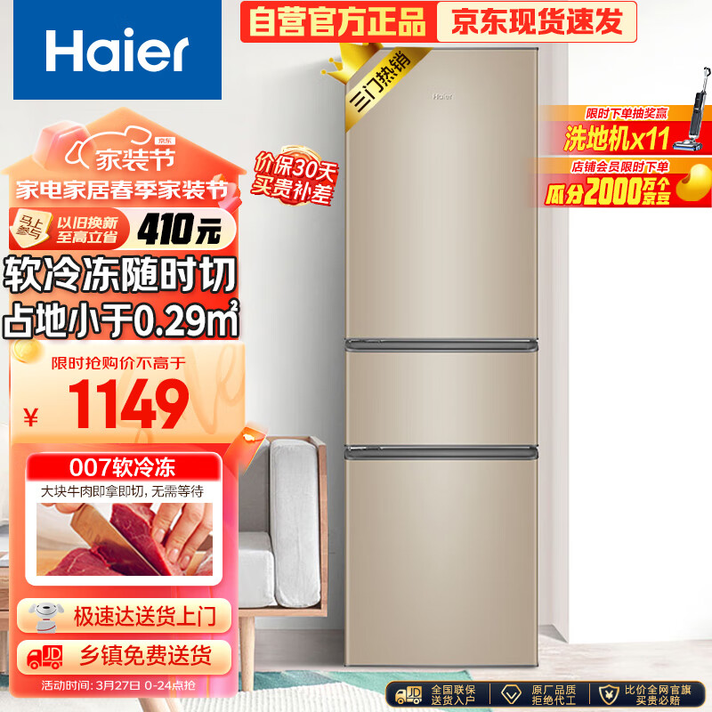 海尔(Haier)216升三门多门小户型迷你电冰箱家用宿舍租房办公室节能省电低噪中门软冷冻冷藏两用BCD-216STPT价格:1149.00元!