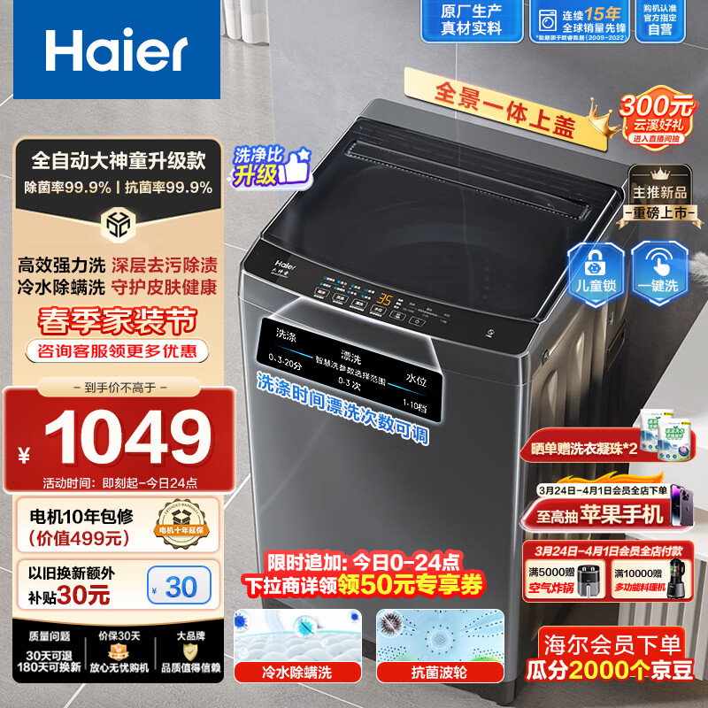 海尔(Haier)波轮洗衣机全自动小型 10公斤大容量 超净洗 自编程 一体上盖 原厂品质 以旧换新EB100Z33Mate1价格:1069.00元!