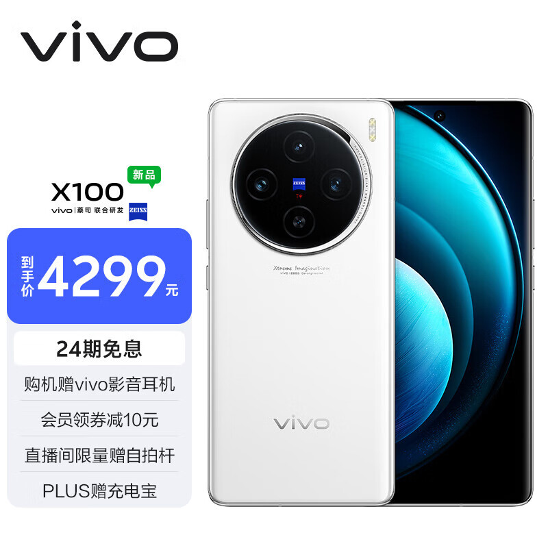 vivo X100 16GB+256GB 白月光 蓝晶×天玑9300 5000mAh蓝海电池 蔡司超级长焦 120W双芯闪充 拍照 手机价格:4299.00元!