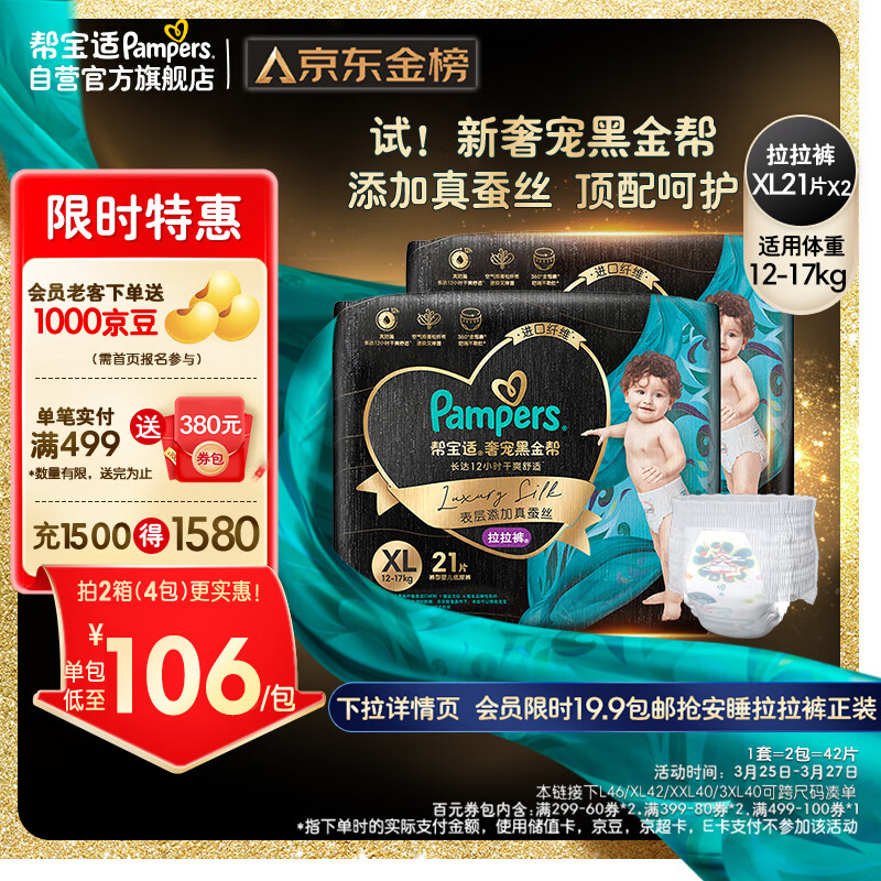 帮宝适黑金帮拉拉裤XL42片(12-17kg)加大码尿裤尿不湿蚕丝 超薄透气价格:240.50元!
