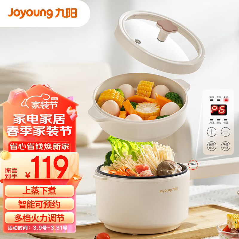 九阳(Joyoung)2L双层电煮锅电炒锅 电热锅 一体宿舍小电锅煮面锅 电炒锅小锅多功能小火锅G186价格:119.00元!