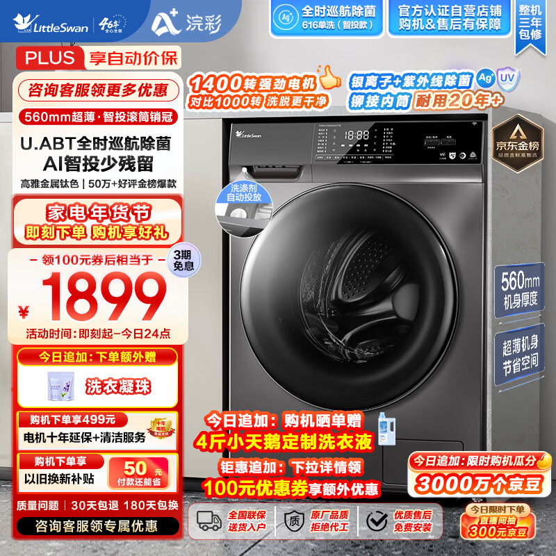 小天鹅(LittleSwan)滚筒洗衣机全自动 智能投放 浣彩系列 紫外线除菌 超薄机身 10公斤 TG100VT616WIADY-T1B价格:1999.00元!