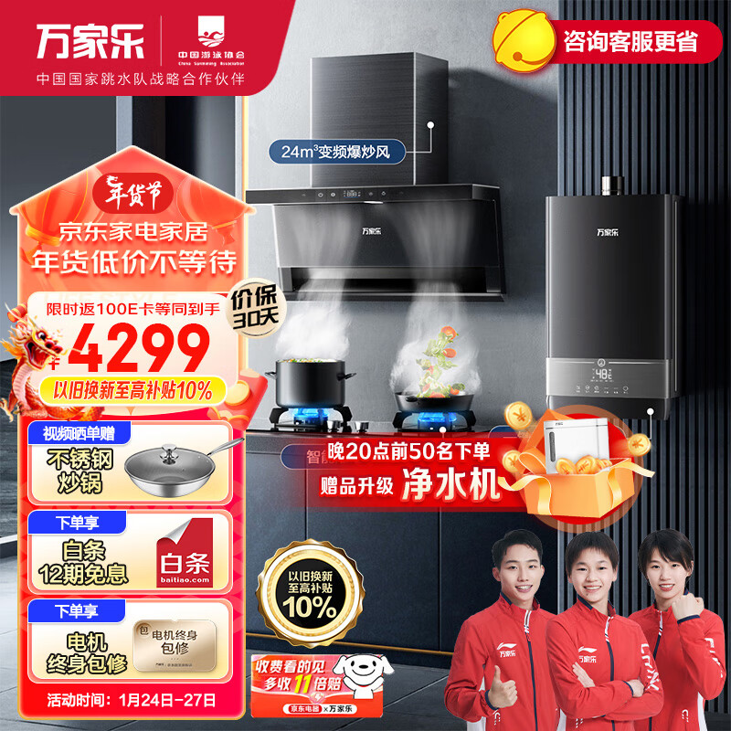 万家乐 抽油烟机 24m3/min顶侧三腔变频静音烟灶联动13L零冷水烟灶热三件套装TAK8+KV063B+13DL1天然气价格:4499.00元!