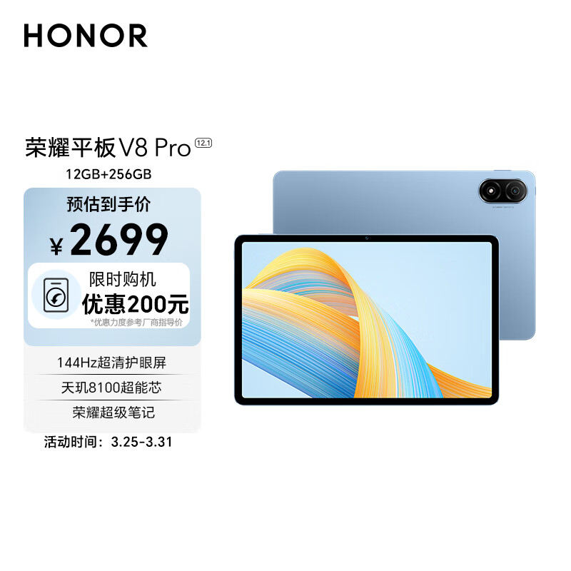 荣耀平板V8 Pro 12.1英寸平板电脑(12+256GB 144Hz高刷大屏 影院级8扬声器 10050mAh电池)晴空蓝价格:2699.00元!