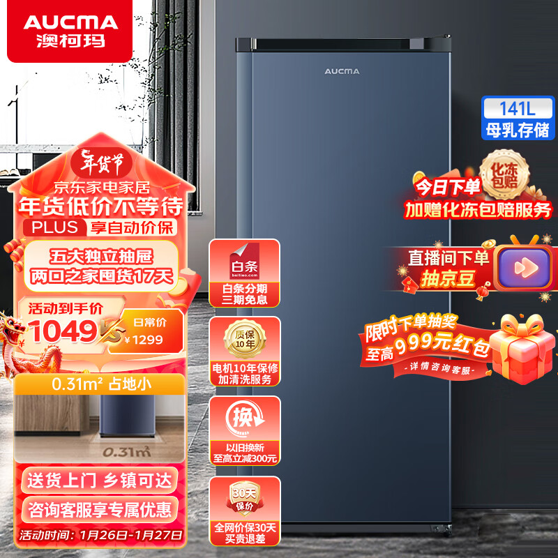 澳柯玛(AUCMA)141升立式冰柜家用冷冻手提式冷柜 母婴母乳小冰柜冰吧 一级能效以旧换新BD-141NE价格:1259.00元!