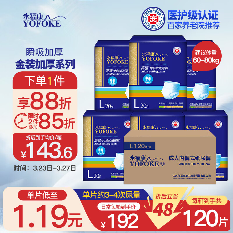 商品名称:永福康金装升级大吸量成人拉拉裤L120片(腰围:80-120cm)