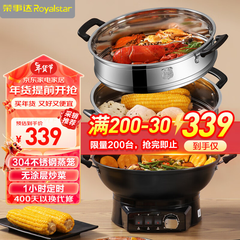 荣事达 电蒸锅电炒锅多功能电热锅多用电火锅电煮锅双层 大容量电锅DRG-T38X价格:369.00元!