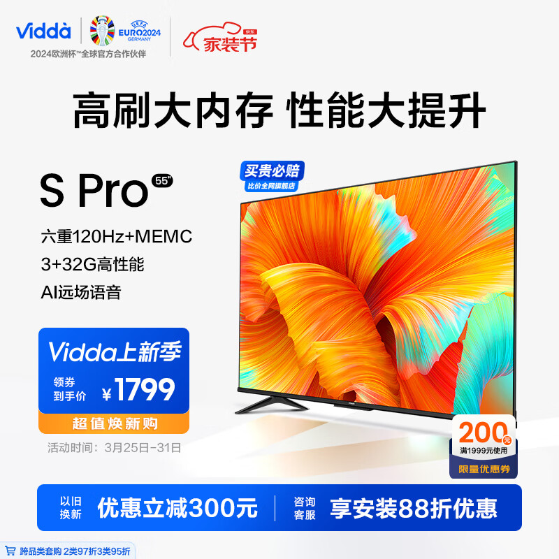 Vidda S55 Pro 海信 55英寸 120Hz高刷 4K超薄屏 3+32G MEMC防抖 智能液晶巨幕电视以旧换新55V1K-S价格:1999.00元!