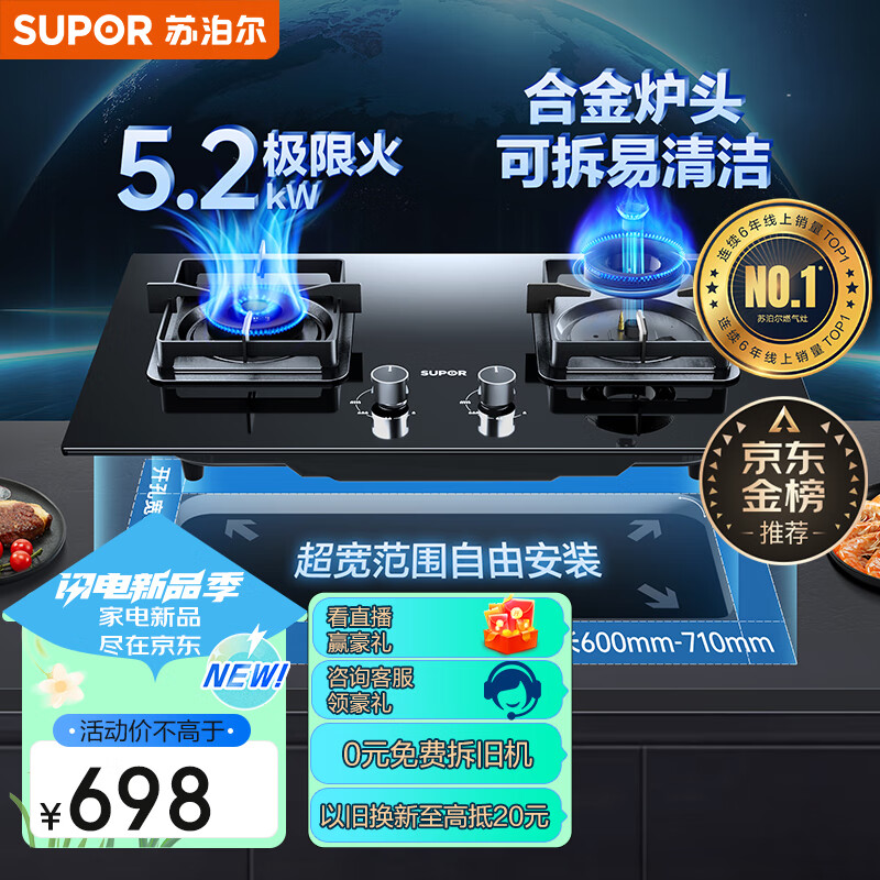 苏泊尔(SUPOR)燃气灶煤气灶双灶家用 液化气双灶具5.2kW大火力 可调节底盘 63%热效率 230°宽域控火 DB28液价格:698.00元!