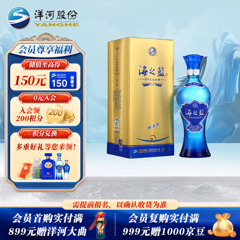 洋河 蓝色经典 海之蓝 42度 480ml 单瓶装 绵柔浓香型白酒价格:148.00元!
