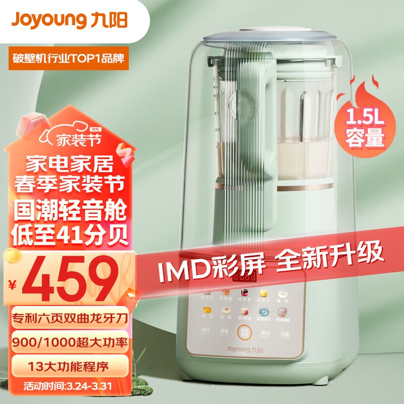 九阳(Joyoung)轻音舱41分贝1.5升低音破壁机家用豆浆机 柔音降噪榨汁机料理机辅食机国潮轻音L15-P919价格:459.00元!