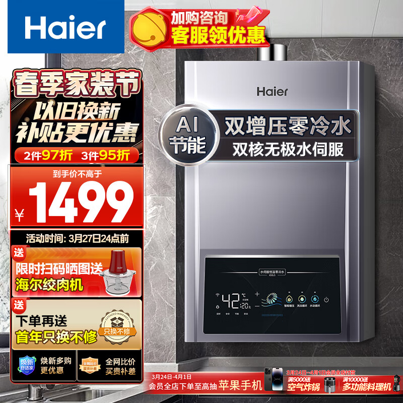 海尔(Haier)13升燃气热水器天然气 双核无极水伺服 大水量双增压零冷水 AI智慧节能节能 JSQ25-13IDOL5-PU1价格:1599.00元!