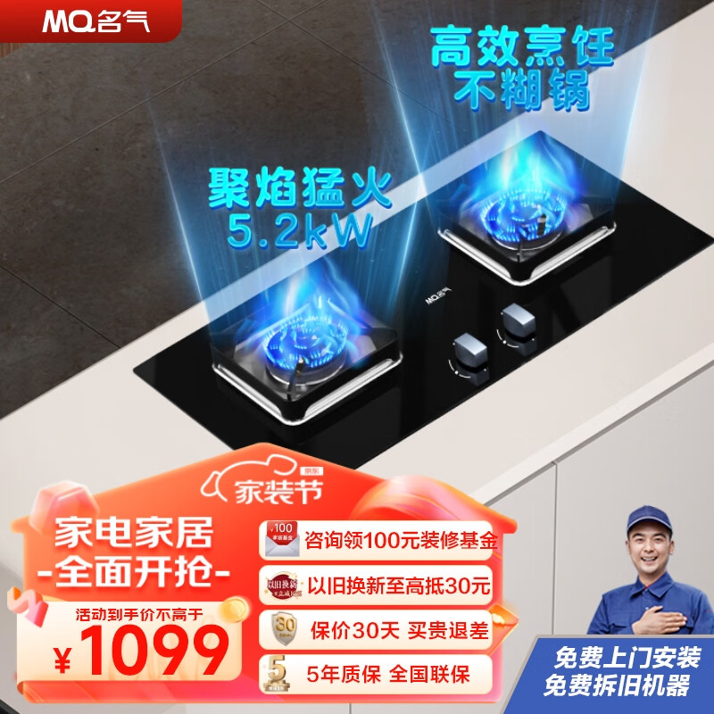 名气(MQ)老板家用天然气燃气灶 升级5.2KW大火力猛火灶 嵌入式灶具 64%热效率 双灶煤气灶 JZT-A6812B价格:1099.00元!