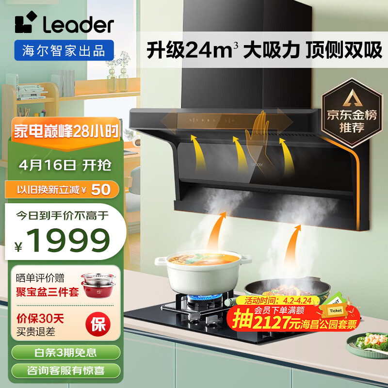Leader海尔智家出品 顶侧双吸抽油烟机 24m3/min大吸力 挥手智控 油烟机灶具套装 IQ92D+Q2BE1(天)价格:1999.00元!