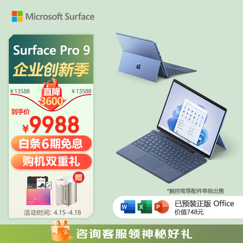 微软Surface Pro 9二合一平板电脑 宝石蓝+宝石蓝键盘盖i7 16G+256G 13英寸120Hz触控屏商务办公笔记本价格:9988.00元!