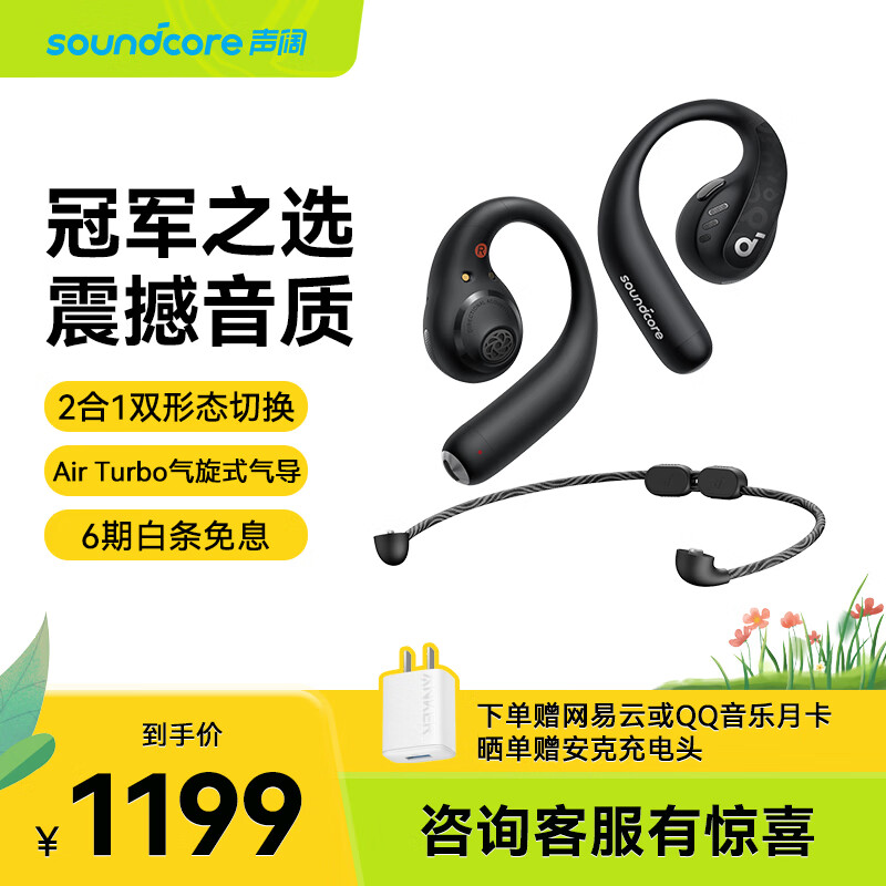 声阔飞跃线2合1不入耳蓝牙耳机AeroFit Pro开放舒适音质颠覆骨传导无线运动跑步骑行46H续航苹果华为黑价格:1199.00元!