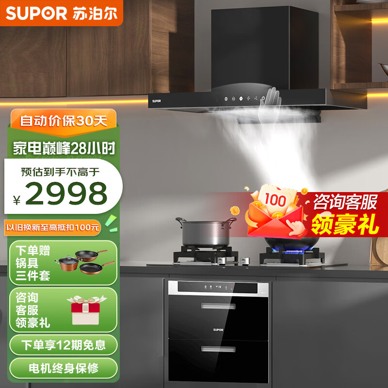 苏泊尔(SUPOR)抽油烟机燃气灶消毒柜套装 欧式家用烟灶消套装 变频挥手自清洁吸油烟机DT39+Q5天然气+508价格:2998.00元!