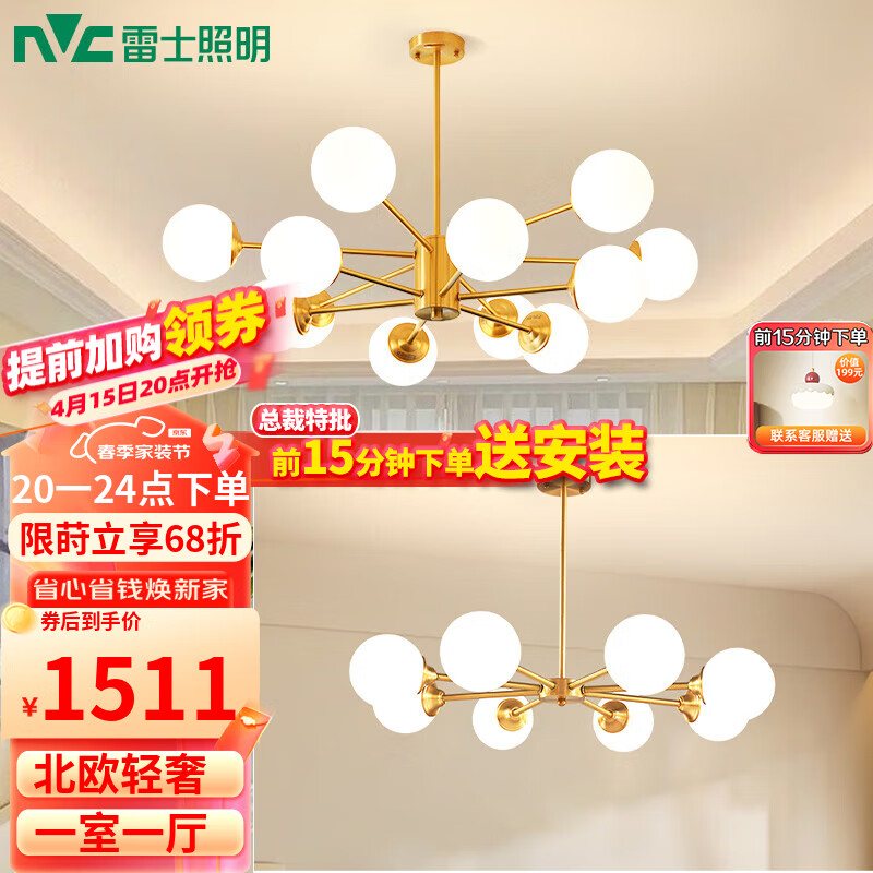 雷士(NVC)吊灯铜魔豆分子灯客厅北欧灯具灯饰创意现代轻奢一室一厅NGD12-2价格:2516.00元!